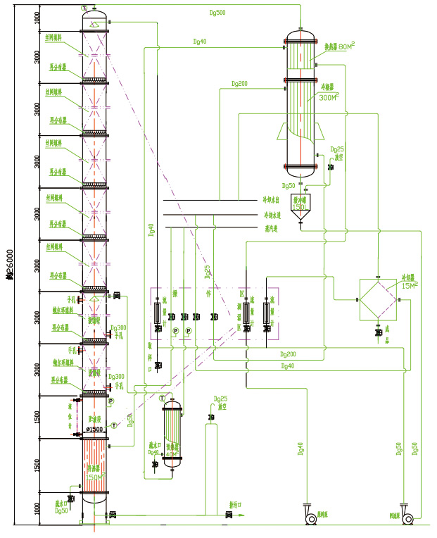 本裝置適用于制藥、食品、輕工、化工等行業的稀酒精回收。也適用于甲醇等其他溶煤的蒸餾。本裝置根據用戶的需要,可根據30℃左右的稀酒精蒸餾至90℃-95℃酒精,成品酒精度數要求再高,可以加大回流比,但產量就相應減少。